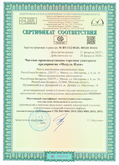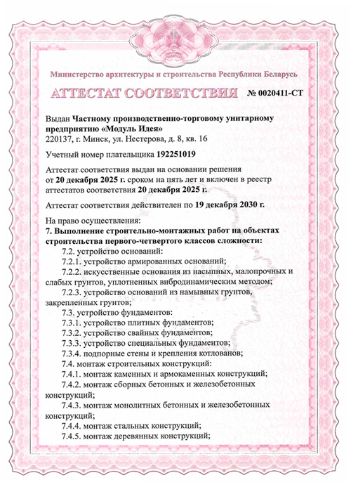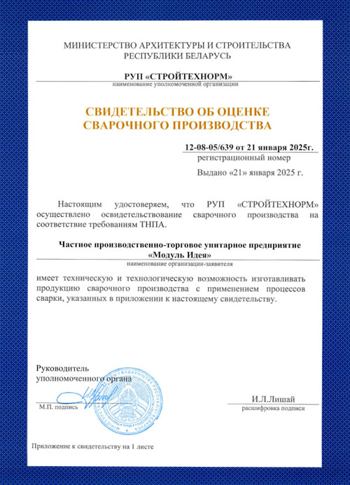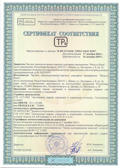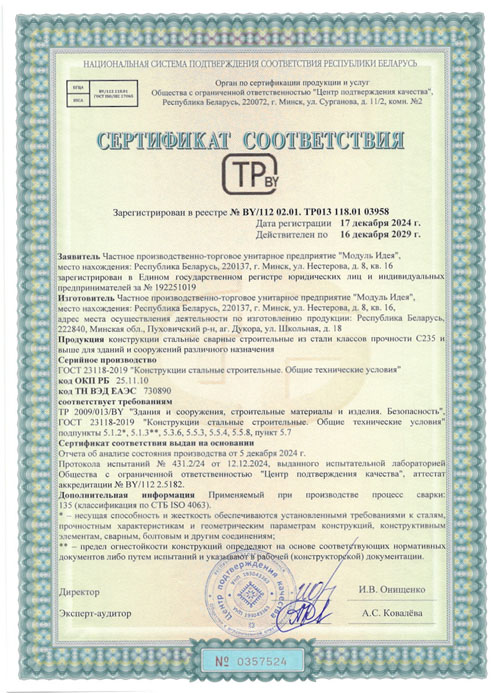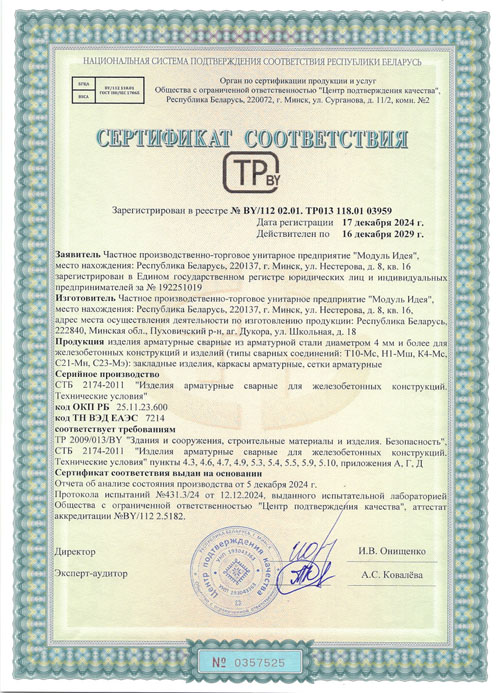 Сертификат соответствия, подтверждающий соответствие продукции "Арматурные изделия для железобетонных конструкций сварные из стержневой арматурной стали и арматурной проволоки диаметром 3 мм и более (или в комбинации с прокатом): отдельные стержни арматуры с типами сварных соединений по длине стержня, арматурные сетки, арматурные каркасы, закладные сварные изделия с анкерами из стержневой арматуры (типы сварных соединений: крестообразные: К3-Мп, стыковые: С21-Мн, С23-Мэ, нахлесточные: Н1-Мш и тавровые: Т11-Мз)" требованиям качества и безопасности, установленными ТР 2009/013/BY "Здания и сооружения, строительные материалы и изделия. Безопасность".