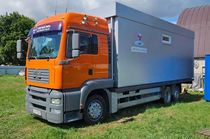Транспортировка блок-модулей осуществляется грузовым автомобилем с краном-манипулятором. Такой способ удобен своей маневренностью, доступностью, возможностью выгружать модульные конструкции в местах с ограниченными подъездными путями. Перевозимые модульные здания могут быть полностью собранными и готовыми к установке, либо перевозиться в разобранном или частично-разобранном виде.